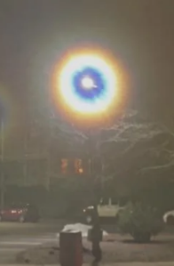 I Googled this effect, it’s called corona phenomenon. Sometimes you can see it around the moon at night. Here’s a photo someone captured of a corona around a light post. That’s what mine looked like!